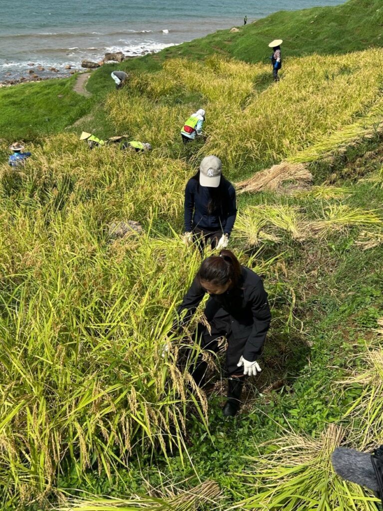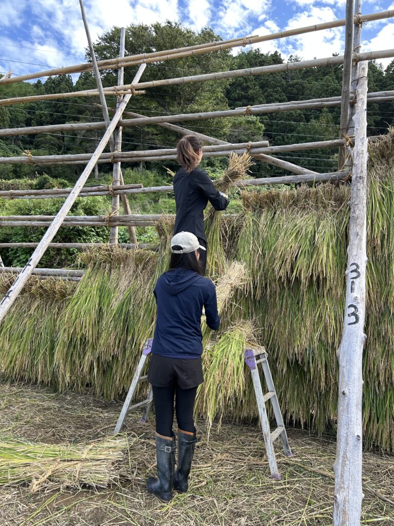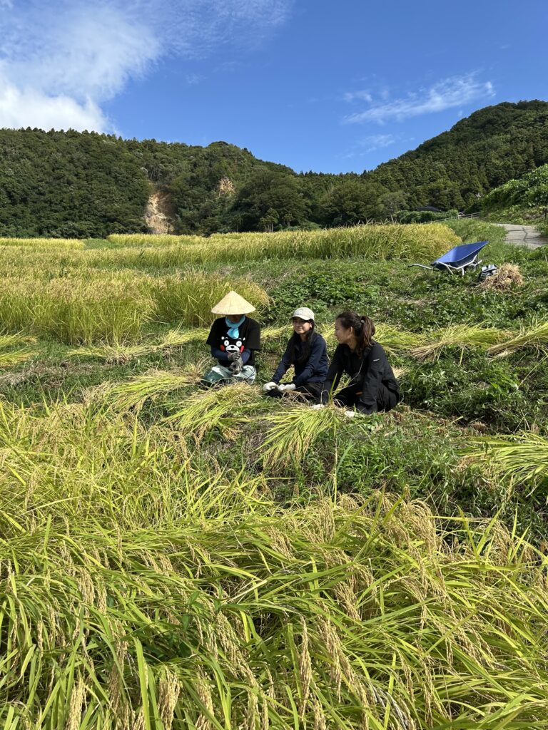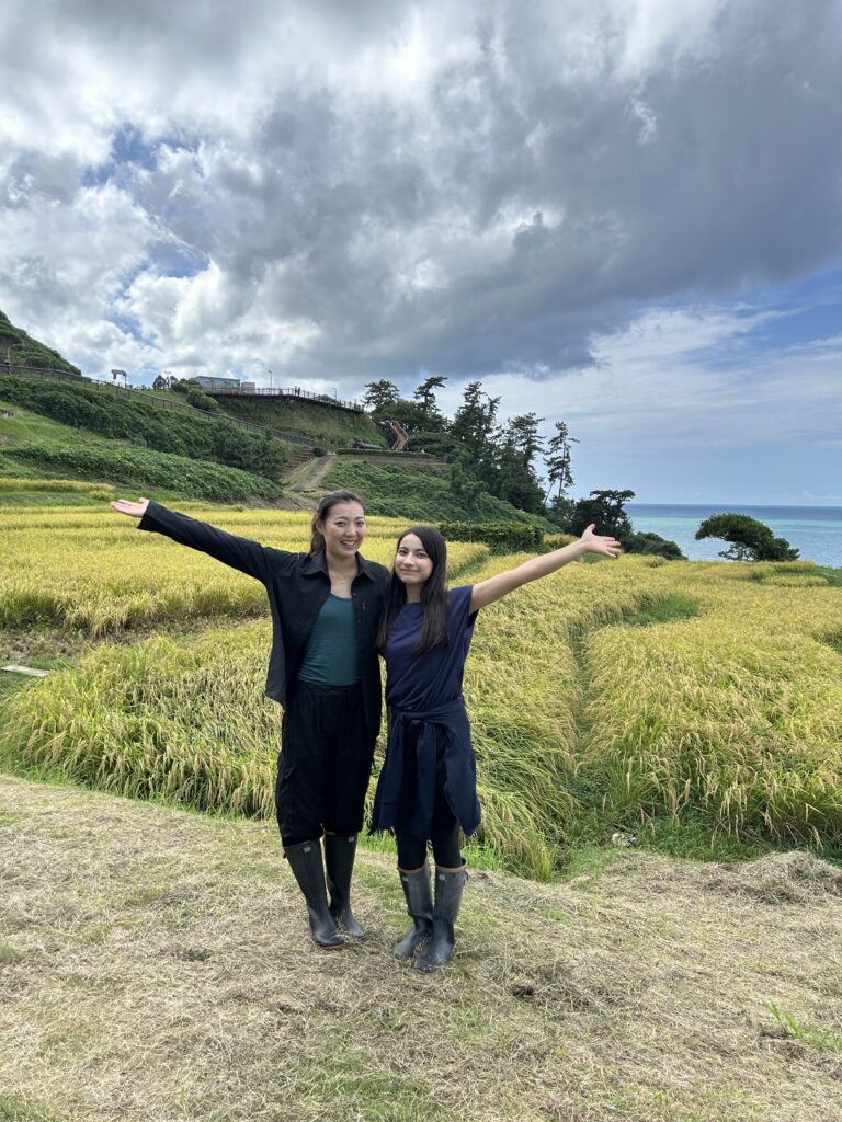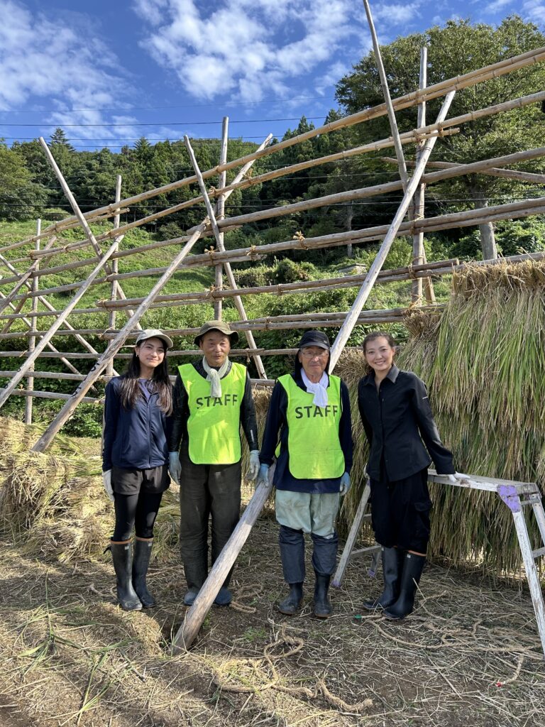 5月に植えた白米千枚田の稲が成長し収穫の時期を迎えたので 2025 JAPAN AMBASSADOR グランプリ加田弓乃と森田多羅が稲刈りと稲架掛けをお手伝いさせて頂きました。 悪天候で一度開催が中止となりましたが無事に参加でき、稲刈り初体験の2人にとってとても貴重な体験となりました。